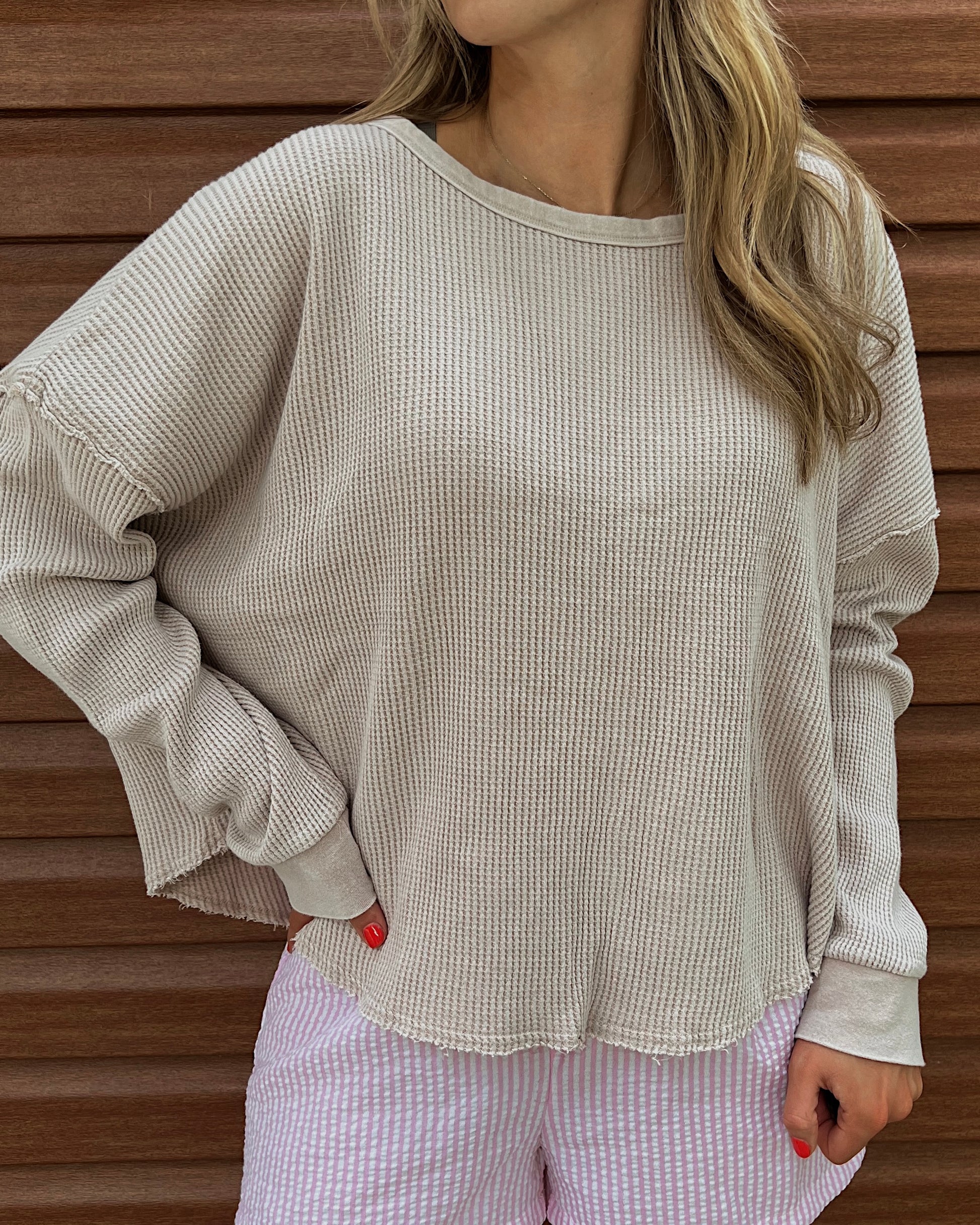 Perfectly comfortable, this mineral wash waffle knit long sleeve is made for lounging and layer. It’s soft, lightweight, and your new go to!